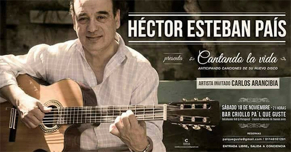 Sábado 18 de noviembre a las 21 BAR CRIOLLO PA`L QUE GUSTE Talcahuano 949 - Ciudad de Buenos Aires Reservas: palqueguste@gmail.com - (011) 4816-1281 Entrada libre, salida a conciencia
