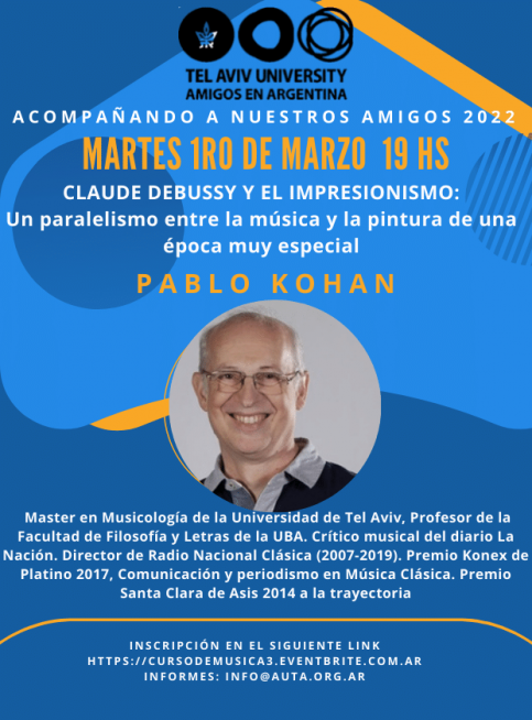 | Acompañando a nuestros Amigos 2022 AMIGOS DE LA UNIVERSIDAD DE TEL AVIV EN ARGENTINA Acompañando a nuestros Amigos 2022 CURSO DE APRECIACIÓN MUSICAL CON VIDEOS CURSO DE MÚSICA CON PRESENTACIÓN DE VIDEOS MARTES 1RO DE MARZO A LAS 19 hs.: CLAUDE DEBUSSY Y EL IMPRESIONISMO: Un paralelismo entre la música y la pintura de una época muy especial A cargo de PABLO KOHAN, Master en Musicología de la Universidad de Tel Aviv, Profesor de la Facultad de Filosofía y Letras de la UBA. Crítico musical del diario La Nación. Director de Radio Nacional Clásica (2007-2019). Premio Konex de Platino 2017, Comunicación y periodismo en Música Clásica. Premio Santa Clara de Asis 2014 a la trayectoria Unirse a la reunión Zoom https://us02web.zoom.us/j/89298357945?pwd=M3gzTjc5V3pTWEY0c2VVUFJCRVdJUT09 ID de reunión: 892 9835 7945 Código de acceso: amigos Informes: info@auta.org.ar |