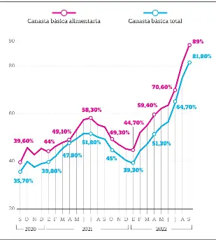 El valor de la canasta básica alimentaria tuvo en el último año un incremento de 89%Entre el billete en el que se ve el rostro de Evita o la cabeza de la taruca –un ciervo que habita en el noroeste del país– y el que lleva impresa la imagen de un hornero –el ave nacional–, hay un cero a la derecha de diferencia. En una Argentina que está lejos de solucionar su problema de alta inflación, se puede comprar hoy con el segundo de los papeles lo que podía adquirirse con el primero hace seis años, si la comparación se refiere a los productos más básicos; concretamente, a los considerados para establecer, sobre la base de sus precios, los umbrales de la indigencia y de la pobreza. Expresado de forma más simple: para comprar lo que se compraba en 2016 con $100, hoy son necesarios $1000.