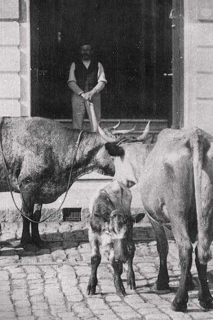 Lechero a domicilio, ordeñando en una calle de adoquines.