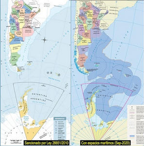 | 3. | Mapa bicontinental que anuncian como "nuevo", ya existe con las mismas características Es el mismo mapa que rige por Ley desde el año 2010 al que se le agrega la plataforma continental marítima recientemente incorporada por otra ley |