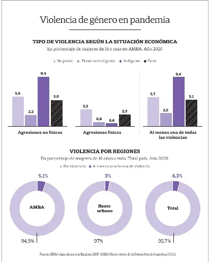 Dentro del hogar, se ha podido confirmar que el 4,3% de las argentinas mayores de 18 años sufrió al menos una forma de agresión desde principios del confinamiento por coronavirus hasta finales del año pasado, según un estudio realizado por el Observatorio de la Deuda Social Argentina (ODSA), de la Universidad Católica Argentina (UCA). El número es aún mayor en el área metropolitana de Buenos Aires (AMBA), región donde se vivió el mayor nivel de restricciones a la circulación durante la pandemia. Allí el porcentaje alcanza el 5,1%.