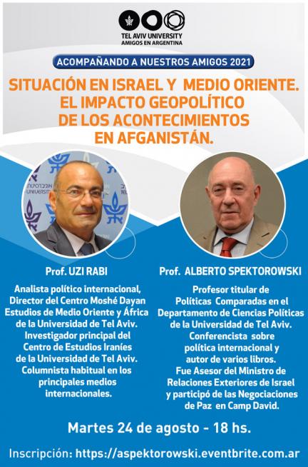 | Acompañando a nuestros amigos 2021 AMIGOS DE LA UNIVERSIDAD DE TEL AVIV EN ARGENTINA ACOMPAÑANDO A NUESTROS AMIGOS SITUACIÓN EN ISRAEL Y EL MEDIO ORIENTE Y EL IMPACTO GEOPOLÍTICO DE LOS ACONTECIMIENTOS EN AFGANISTÁN Prof. UZI RABI Analista político internacional, Director del Centro Moshé Dayan de Estudios de Medio Oriente y África de la Universidad de Tel Aviv. Investigador principal del Centro de Estudios Iraníes de la Universidad de Tel Aviv Columnista habitual en los principales medios internacionales Prof. ALBERTO SPEKTOROWSKI Profesor titular de Políticas Comparadas en el Departamento de Ciencias Políticas de la Universidad de Tel Aviv. Conferencista sobre política internacional y autor de varios libros. Fue Asesor del Ministro de Relaciones Exteriores de Israel y participó de las Negociaciones de Paz en Camp David Martes 24 de agosto a las 18 hs. Inscripción en el siguiente link https://aspektorowski.eventbrite.com.ar Informes: info@auta.org.ar