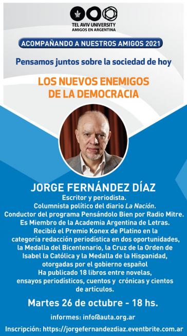 | Acompañando a nuestros amigos 2021 AMIGOS DE LA UNIVERSIDAD DE TEL AVIV EN ARGENTINA Acompañando a nuestros Amigos Pensamos juntos sobre la sociedad de hoy "LOS NUEVOS ENEMIGOS DE LA DEMOCRACIA" JORGE FERNÁNDEZ DÍAZ Escritor y periodista. Columnista político del diario La Nación. Conductor del programa Pensándolo Bien por Radio Mitre. Ha publicado 18 libros entre novelas, ensayos periodísticos, cuentos y crónicas y cientos de artículos. Es Miembro de la Academia Argentina de Letras. Entre muchos otros reconocimientos recibió el Premio Konex de Platino en la categoría redacción periodística en dos oportunidades, la Medalla del Bicentenario, la Cruz de la Orden de Isabel la Católica y la Medalla de la Hispanidad, otorgadas por el gobierno español Martes 26 de octubre 18 hs. Inscripción en el siguiente link: https://jorgefernandezdiaz.eventbrite.com.ar Cupos limitados Informes: info@auta.org.ar |