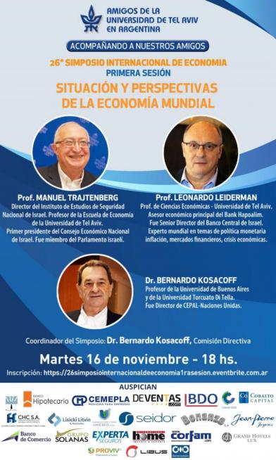 | SIMPOSIO INTERNACIONAL DE ECONOMÍA 2021 AMIGOS DE LA UNIVERSIDAD DE TEL AVIV EN ARGENTINA Acompañando a nuestros Amigos 26° SIMPOSIO INTERNACIONAL DE ECONOMÍA Primera sesión: SITUACIÓN Y PERSPECTIVAS DE LA ECONOMÍA MUNDIAL Prof. MANUEL TRAJTENBERG Director del Instituto de Estudios de Seguridad Nacional de Israel. Profesor de la Escuela de Economía de la Universidad de Tel Aviv. Fue Presidente del Comité de Planificación y Presupuestos del Consejo para la Educación Superior en Israel, consultor del Ministerio de Industria, Comercio y Trabajo de la Oficina del Primer Ministro, primer presidente del Consejo Económico Nacional de Israel y miembro del Parlamento israelí (Knesset) Dr. LEONARDO LEIDERMAN Profesor de Ciencias Económicas en la Universidad de Tel Aviv. Asesor económico principal del Bank Hapoalim. Fue Vicepresidente del Banco Central de Israel y Economista Jefe de Mercados Emergentes en el Deutsche Bank. Experto mundial en temas de política monetaria, inflación, mercados financieros, crisis económicas Coordinador: Dr. BERNARDO KOSACOFF Profesor de la Universidad de Buenos Aires y de la Universidad Torcuato Di Tella. Fue Director de CEPAL-Naciones Unidas Coordinador del Simposio, Dr. Bernardo Kosacoff, Comisión Directiva Martes 16 de noviembre 18 hs. Inscripción en el siguiente link: https://26simposiointernacionaldeeconomia1rasesion.eventbrite.com.ar Cupos limitados Informes: info@auta.org.ar |