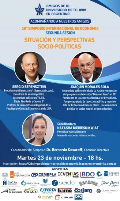 | SIMPOSIO INTERNACIONAL DE ECONOMÍA 2021 AMIGOS DE LA UNIVERSIDAD DE TEL AVIV EN ARGENTINA Acompañando a nuestros Amigos 26° SIMPOSIO INTERNACIONAL DE ECONOMÍA Segunda sesión: SITUACIÓN Y PERSPECTIVAS SOCIO-POLÍTICAS SERGIO BERENSZTEIN Presidente de Berensztein® (Berensztein.com), consultora de análisis político y estratégico. Director Académico del Instituto de Neurociencias y Políticas Públicas de Fundación INECO. Profesor de la Maestría en Negocios de la Facultad de Ciencias Económicas de la UBA. Presidente de IPS (International Pres Service) para América Latina. JOAQUIN MORALES SOLÁ Columnista político del diario La Nación y conductor del programa de televisión “Desde el llano” en el canal de cable TN. Es miembro de la Academia Nacional de Periodismo. Fue prosecretario de la sección política y segundo Jefe de Redacción del diario Clarín. Fue Columnista político de la revista Noticias y Telefé Noticias y condujo los programas Dos en la Noticia y Bajo Palabra por Canal 9. Coordinadora: NATASHA NIEBIESKIKWIAT Periodista especializada en temas de relaciones internacionales Coordinador del Simposio, Dr. Bernardo Kosacoff, Comisión Directiva Martes 23 de noviembre 18 hs. Inscripción en el siguiente link: https://26simposiointernacionaldeeconomia2dasesion.eventbrite.com.ar Cupos limitados Informes: info@auta.org.ar |