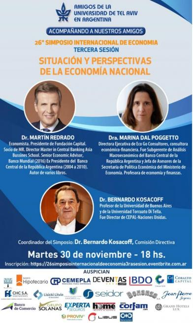 | SIMPOSIO INTERNACIONAL DE ECONOMÍA 2021 AMIGOS DE LA UNIVERSIDAD DE TEL AVIV EN ARGENTINA Acompañando a nuestros Amigos 26° SIMPOSIO INTERNACIONAL DE ECONOMÍA Tercera sesión: SITUACIÓN Y PERSPECTIVAS DE LA ECONOMÍA NACIONAL Dr. MARTÍN REDRADO Economista. Presidente de Fundación Capital. Director Master in Central Banking Asia Bussines School. Senior Economic Advisor Banco Mundial. Ex Presidente del Banco Central de la República Argentina. Profesor de Economía Internacional en la Universidad Católica Argentina. Autor de varios libros, destacándose entre otros “Cómo Sobrevivir a la Globalización” Sin Reservas “Argentina Primero” Dra. MARINA DAL POGGETTO Directora Ejecutiva de Eco Go Consultores - Consultora económico-financiera. Fue Subgerente de Análisis Macroeconómico del Banco Central de la República Argentina y Jefa de Asesores de la Secretaría de Política Económica del Ministerio de Economía. Profesora de economía y finanzas en UBA, UCES y UTDT Dr. BERNARDO KOSACOFF Profesor de la Universidad de Buenos Aires y de la Universidad Torcuato Di Tella. Fue Director de CEPAL-Naciones Unidas Coordinador del Simposio, Dr. Bernardo Kosacoff, Comisión Directiva Martes 30 de noviembre 18 hs. Inscripción en el siguiente link: https://26simposiointernacionaldeeconomia3rasesion.eventbrite.com.ar Cupos limitados Informes: info@auta.org.ar |