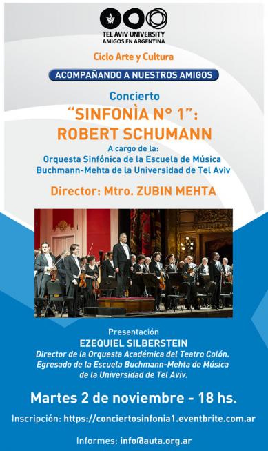 | Acompañando a nuestros amigos 2021 AMIGOS DE LA UNIVERSIDAD DE TEL AVIV EN ARGENTINA Acompañando a nuestros Amigos Ciclo de Arte y Cultura 2021 Concierto: “SINFONÍA N° 1” ROBERT SCHUMANN A cargo de: Orquesta Sinfónica de la Escuela de Música Buchmann-Mehta de la Universidad de Tel Aviv Director: Mtro. ZUBIN MEHTA Presentación: EZEQUIEL SILBERSTEIN Director de la Orquesta Académica del Teatro Colón. Egresado de la Escuela Buchmann-Mehta de Música de la Universidad de Tel Aviv Martes 2 de noviembre a las 18.00 hs. Inscripción en el siguiente link: https://conciertosinfonia1.eventbrite.com.ar Informes: info@auta.org.ar / tel. 4833-7090 |