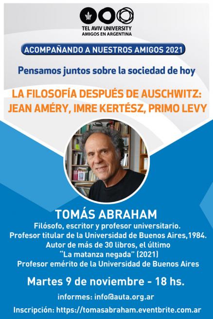 | Acompañando a nuestros amigos 2021 AMIGOS DE LA UNIVERSIDAD DE TEL AVIV EN ARGENTINA Acompañando a nuestros Amigos Pensamos juntos sobre la sociedad de hoy LA FILOSOFÍA DESPUÉS DE AUSCHWITZ: JEAN AMÉRY, IMRE KERTÉSZ, PRIMO LEVY TOMÁS ABRAHAM Filósofo, escritor y profesor universitario Profesor titular de Filosofía de la Universidad de Buenos Aires desde 1984 Autor de más de 30 libros, el último “La matanza negada” (2021) Profesor emérito de la Universidad de Buenos Aires Martes 9 de noviembre 18 hs. Inscripción en el siguiente link: https://tomasabraham.eventbrite.com.ar Cupos limitados Informes: info@auta.org.ar |