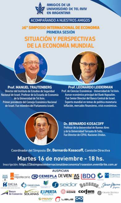 | SIMPOSIO INTERNACIONAL DE ECONOMÍA 2021 AMIGOS DE LA UNIVERSIDAD DE TEL AVIV EN ARGENTINA Acompañando a nuestros Amigos 26° SIMPOSIO INTERNACIONAL DE ECONOMÍA Primera sesión: SITUACIÓN Y PERSPECTIVAS DE LA ECONOMÍA MUNDIAL Prof. MANUEL TRAJTENBERG Director del Instituto de Estudios de Seguridad Nacional de Israel. Profesor de la Escuela de Economía de la Universidad de Tel Aviv. Fue Presidente del Comité de Planificación y Presupuestos del Consejo para la Educación Superior en Israel, consultor del Ministerio de Industria, Comercio y Trabajo de la Oficina del Primer Ministro, primer presidente del Consejo Económico Nacional de Israel y miembro del Parlamento israelí (Knesset) Dr. LEONARDO LEIDERMAN Profesor de Ciencias Económicas en la Universidad de Tel Aviv. Asesor económico principal del Bank Hapoalim. Fue Vicepresidente del Banco Central de Israel y Economista Jefe de Mercados Emergentes en el Deutsche Bank. Experto mundial en temas de política monetaria, inflación, mercados financieros, crisis económicas Coordinador: Dr. BERNARDO KOSACOFF Profesor de la Universidad de Buenos Aires y de la Universidad Torcuato Di Tella. Fue Director de CEPAL-Naciones Unidas Coordinador del Simposio, Dr. Bernardo Kosacoff, Comisión Directiva Martes 16 de noviembre 18 hs. Inscripción en el siguiente link: https://26simposiointernacionaldeeconomia1rasesion.eventbrite.com.ar Cupos limitados Informes: info@auta.org.ar |