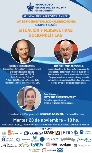 | SIMPOSIO INTERNACIONAL DE ECONOMÍA 2021 AMIGOS DE LA UNIVERSIDAD DE TEL AVIV EN ARGENTINA Acompañando a nuestros Amigos 26° SIMPOSIO INTERNACIONAL DE ECONOMÍA Segunda sesión: SITUACIÓN Y PERSPECTIVAS SOCIO-POLÍTICAS SERGIO BERENSZTEIN Presidente de Berensztein® (Berensztein.com), consultora de análisis político y estratégico. Director Académico del Instituto de Neurociencias y Políticas Públicas de Fundación INECO. Profesor de la Maestría en Negocios de la Facultad de Ciencias Económicas de la UBA. Presidente de IPS (International Pres Service) para América Latina. JOAQUIN MORALES SOLÁ Columnista político del diario La Nación y conductor del programa de televisión “Desde el llano” en el canal de cable TN. Es miembro de la Academia Nacional de Periodismo. Fue prosecretario de la sección política y segundo Jefe de Redacción del diario Clarín. Fue Columnista político de la revista Noticias y Telefé Noticias y condujo los programas Dos en la Noticia y Bajo Palabra por Canal 9. Coordinadora: NATASHA NIEBIESKIKWIAT Periodista especializada en temas de relaciones internacionales Coordinador del Simposio, Dr. Bernardo Kosacoff, Comisión Directiva Martes 23 de noviembre 18 hs. Inscripción en el siguiente link: https://26simposiointernacionaldeeconomia2dasesion.eventbrite.com.ar Cupos limitados Informes: info@auta.org.ar |