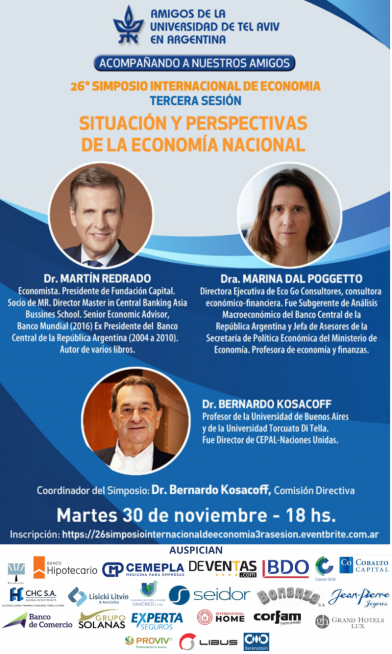 | SIMPOSIO INTERNACIONAL DE ECONOMÍA 2021 AMIGOS DE LA UNIVERSIDAD DE TEL AVIV EN ARGENTINA Acompañando a nuestros Amigos 26° SIMPOSIO INTERNACIONAL DE ECONOMÍA Tercera sesión: SITUACIÓN Y PERSPECTIVAS DE LA ECONOMÍA NACIONAL Dr. MARTÍN REDRADO Economista. Presidente de Fundación Capital. Director Master in Central Banking Asia Bussines School. Senior Economic Advisor Banco Mundial. Ex Presidente del Banco Central de la República Argentina. Profesor de Economía Internacional en la Universidad Católica Argentina. Autor de varios libros, destacándose entre otros “Cómo Sobrevivir a la Globalización” Sin Reservas “Argentina Primero” Dra. MARINA DAL POGGETTO Directora Ejecutiva de Eco Go Consultores - Consultora económico-financiera. Fue Subgerente de Análisis Macroeconómico del Banco Central de la República Argentina y Jefa de Asesores de la Secretaría de Política Económica del Ministerio de Economía. Profesora de economía y finanzas en UBA, UCES y UTDT Dr. BERNARDO KOSACOFF Profesor de la Universidad de Buenos Aires y de la Universidad Torcuato Di Tella. Fue Director de CEPAL-Naciones Unidas Coordinador del Simposio, Dr. Bernardo Kosacoff, Comisión Directiva Martes 30 de noviembre 18 hs. Inscripción en el siguiente link: https://26simposiointernacionaldeeconomia3rasesion.eventbrite.com.ar Cupos limitados Informes: info@auta.org.ar |