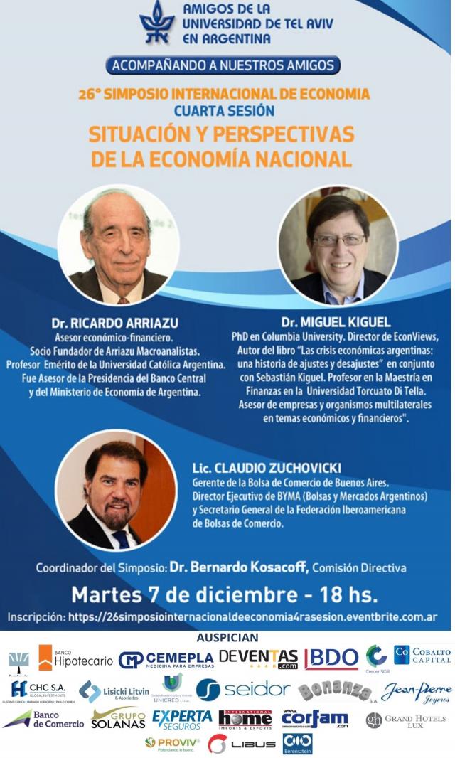 | SIMPOSIO INTERNACIONAL DE ECONOMÍA 2021 AMIGOS DE LA UNIVERSIDAD DE TEL AVIV EN ARGENTINA Acompañando a nuestros Amigos 26° SIMPOSIO INTERNACIONAL DE ECONOMÍA Cuarta sesión: SITUACIÓN Y PERSPECTIVAS DE LA ECONOMÍA NACIONAL Dr. RICARDO ARRIAZU Asesor económico-financiero. Profesor titular de grado y posgrado de la Universidad Católica Argentina. Fue Asesor de la Presidencia del Banco Central y del Ministerio de Economía de Argentina Dr. MIGUEL KIGUEL Asesor económico-financiero, Director de EconViews, Director de Megainver Fondos Comunes de Inversión. Profesor de Economía de la Universidad Torcuato Di Tella. Lic. CLAUDIO ZUCHOVICKI Gerente de la Bolsa de Comercio de Buenos Aires. Director Ejecutivo de BYMA (Bolsas y Mercados Argentinos) y Secretario General de la Federación Iberoamericana de Bolsas de Comercio. Coordinador del Simposio, Dr. Bernardo Kosacoff, Comisión Directiva Martes 7 de diciembre 18 hs. Inscripción en el siguiente link: https://26simposiointernacionaldeeconomia4tasesion.eventbrite.com.ar Cupos limitados Informes: info@auta.org.ar |