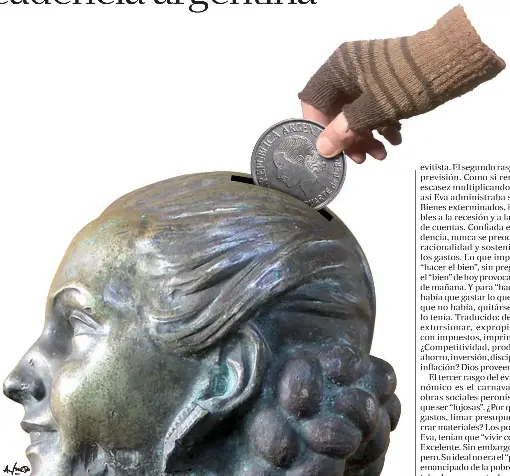 En conclusión: nada en la mentalidad económica evitista promueve la autonomía personal, la movilidad social, la iniciativa individual, todo fomenta la dependencia, el oportunismo, el clientelismo; nada es orientado a crecer y producir, todo a “ayudar” y distribuir. Nada más lejos de una “cultura del trabajo”. Ironía involuntaria o ley del contrapaso, el rostro de Eva en los billetes de 100 pesos es la mejor metáfora de su herencia económica: el tiempo se llevó todo su valor.
