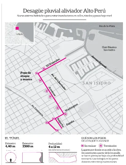 El desagüe pluvial aliviador Alto Perú se inició en marzo pasado y está previsto que finalice en febrero de 2024. Con alrededor de ocho meses de trabajo, se avanzó en la construcción de cinco pozos de ataque –lugar por donde se accede a la obra– y 650 metros de túnel con un diámetro de 4,40 metros.