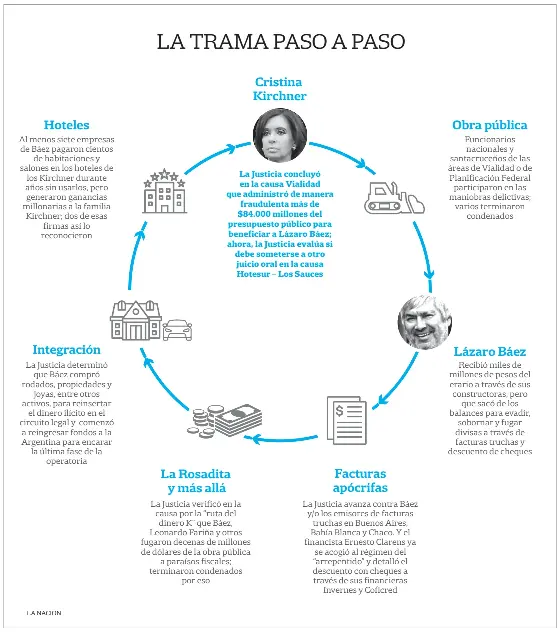 La primera fase quedó en evidencia en la causa Vialidad. El Tribunal Oral Federal N° 2 concluyó que la vicepresidenta y otros funcionarios administraron de manera fraudulenta más de $84.000 millones del presupuesto para beneficiar a Lázaro Báez. Es decir, fondos del Estado que se desviaron a fines delictivos. “Allí estuvo el primer ardid, direccionando la obra pública a ciertos bolsillos”, indicó uno de los exreferentes de la unidad antilavado.