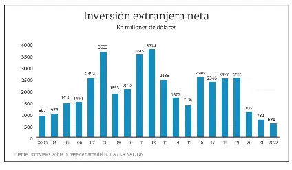 El año pasado ingresaron a la Argentina US$570 millones para inversiones extranjeras. Es la cifra más baja en al menos 20 años, según el Banco Central. Además, el monto es 6,6 veces menos que el promedio de 2011/2012, cuando se marcó un récord de US$3630 millones, justo antes de que la confirmación del cepo cambiario, apenas iniciado el segundo mandato de Cristina Kirchner, hiciera caer esa fuente de recursos.