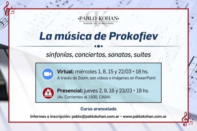 | PABLO KOHAN: La música de Prokofiev Un curso a distancia y/o presencial para todo público En marzo, un curso centrado en la música de Sergei Prokofiev, uno de los dos compositores del siglo XX más escuchados e interpretados en el XXI (el otro es su coterráneo Dmitri Shostakovich). El curso es para todo público, es decir, para quienes (dicen que) no saben nada de música clásica también. Las clases serán dictadas a distancia a través del Zoom y también de modo presencial (Av. Corrientes, al 1.500). Horario: A distancia: los miércoles 1, 8, 15 y 22 de marzo, a las 18. Modo presencial: los jueves 2, 9, 16 y 23 de marzo, a las 18 (en caso de necesidad se pueden alternar las dos modalidades) Las clases son grabadas para quienes puedan requerirlas. CURSO ARANCELADO Informes e inscripción: pablo@pablokohan.com.ar https://pablokohan.com.ar/nota/379-Sergei-Prokofiev-para-conocerte-mejor Pablo Kohan - Master en Musicología de la Universidad de Tel Aviv