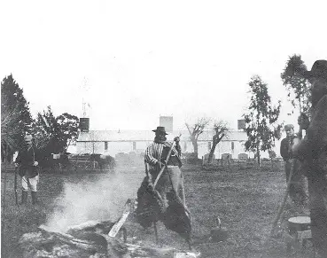 “otras se les antoja caracuces, que son los huesos que tiene tuétano, que revuelven con un palito, y se alimentan de aquella admirable sustancia; pero lo más prodigiosos es verlos matar una vaca, sacarle el mondongo y todo el sebo que juntan en el vientre, y con solo una brasa de fuego o un trozo de estiércol seco de las vacas, prenden fuego a aquel sebo, y luego que empieza a arder y comunicarse a la carne gorda y huesos, forma una extraordinaria iluminación, y así vuelven a unir el vientre de la vaca, dejándola toda una noche o una considerable parte del día, para que se ase bien y a la mañana o tarde siguiente la rodean los gauderios y con sus cuchillos va sacando, cada uno, el trozo que le conviene, sin pan ni otro aderezo alguno, y luego que satisfacen su apetito abandonan el resto, a excepción de uno u otro que lleva un trozo a su campestre cortejo”.