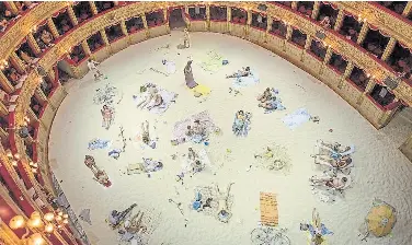 Están recostados sobre la arena, bajo el sol, durante unas vacaciones que podrían ser las últimas. “Este año el mar está verde como un bosque: ¡eutrofización!”, canta el coro integrado por quince personas, mientras el público observa desde un andamio ubicado a cuatro metros de altura. “Nuestros cuerpos están cubiertos de un vellón verde resbaladizo, nuestros trajes de baño se están llenando de algas”, continúa el elenco hacia el final de Sun & Sea, óperaperformance que representó a Lituania en la Bienal de Venecia en 2019 y se llevó el León de Oro al mejor pabellón.