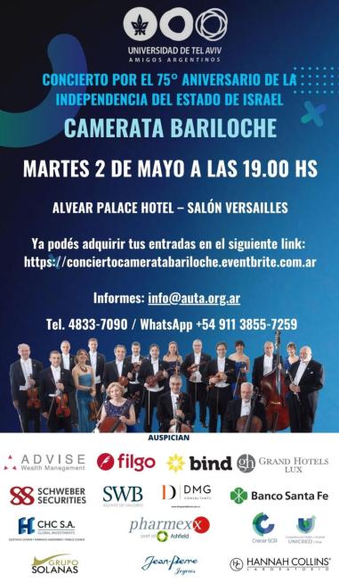 | ACTIVIDADES 2023 AMIGOS DE LA UNIVERSIDAD DE TEL AVIV EN ARGENTINA Te invitamos a festejar juntos el 75° ANIVERSARIO DE LA INDEPENDENCIA DEL ESTADO DE ISRAEL Concierto de la CAMERATA BARILOCHE MARTES 2 DE MAYO DE 2023 A LAS 19 hs. Alvear Palace Hotel – Salón Versailles Ya podés adquirir tus entradas en el siguiente link: https://conciertocameratabariloche.eventbrite.com.ar Informes: Info@auta.org.ar / WhatsApp +54 911 3855-7259 / 4833-7090 |