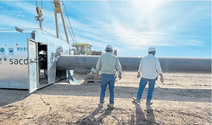 Pese a estas demoras, diez meses después de haberse adjudicado la construcción del gasoducto, la obra está llegando a su etapa final en tiempo récord. la nacion viajó con otros medios a esta ciudad ubicada sobre la ruta nacional 143 –la “ruta del desierto”–, para ver el avance de la construcción y la llegada de los últimos camiones con los tubos de 36 pulgadas (91 centímeros de diámetro), 12 metros de largo y 3250 kilos, por donde se transportarán 11 millones de metros cúbicos de gas por día (m3/d) desde fines de junio.