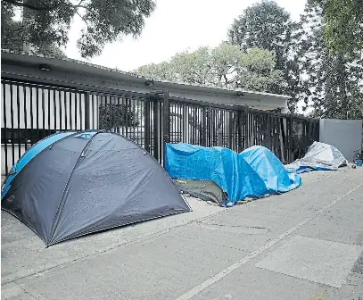 Sobre la avenida Figueroa Alcorta, entre la cancha de River Plate y el Club Hípico Argentino, sorprende una hilera de cuatro carpas azules. Las entradas de cada una de ellas dan la espalda a la calle y, a falta de una superficie blanda donde clavar estacas, sus toldos se sostienen con adoquines. En los alrededores se ve una escoba, un paraguas y algunos cartones que ofician como alfombra.