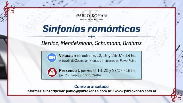 |  | PABLO KOHAN: Sinfonías románticas Un curso a distancia y/o presencial para todo público https://pablokohan.com.ar/nota/393-Sinfonias-romanticas En julio, con obras de Berlioz, Mendelssohn, Schumann y Brahms, tendremos un curso centrado en sinfonías del romanticismo. El curso es para todo público, es decir, para quienes (dicen que) no saben nada de música clásica también. Las clases serán dictadas a distancia a través del Zoom y también de modo presencial (Av. Corrientes, al 1500). Horario: A distancia: los miércoles 5, 12, 19 y 26 de julio, a las 18. Modo presencial: los jueves 6, 13, 20 y 27 de julio, a las 18. (en caso de necesidad se pueden alternar las dos modalidades) Las clases son grabadas para quienes puedan requerirlas. CURSO ARANCELADO Informes e inscripción: pablo@pablokohan.com.ar Pablo Kohan - Master en Musicología de la Universidad de Tel Aviv