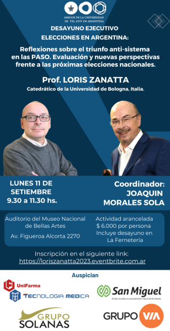 | ACTIVIDADES 2023 DESAYUNO EJECUTIVO ELECCIONES EN ARGENTINA: Reflexiones sobre el triunfo anti-sistema en las PASO. Evaluación y nuevas perspectivas frente a las próximas elecciones nacionales. con la participación del reconocido analista político italiano: Prof. LORIS ZANATTA Catedrático de Historia de América Latina y Profesor titular en el Departamento de Ciencias Políticas y Sociales de la Universidad de Bologna, Italia. Coordinador de la Maestría en Ciencias Internacionales y Diplomáticas. Autor de varios libros y artículos, publicados en Europa y Latinoamérica. Columnista de los diarios La Nación y Clarín y en varios medios de Latinoamérica, Italia y España. Coordinador: JOAQUÍN MORALES SOLÁ Periodista y analista político del diario La Nación. Conductor del programa periodístico Desde el Llano - TN. LUNES 11 DE SETIEMBRE – 9.30 a 11.30 hs. Auditorio del Museo Nacional de Bellas Artes Av. Figueroa Alcorta 2270 Actividad arancelada $ 6.000 por persona - incluye el desayuno Inscripción en el siguiente link: https://loriszanatta2023.eventbrite.com.ar Para abonar por transferencia comunicarse con nuestra oficina: info@auta.org.ar / 4833-7090 / WhatsApp: 113-855-7259 |