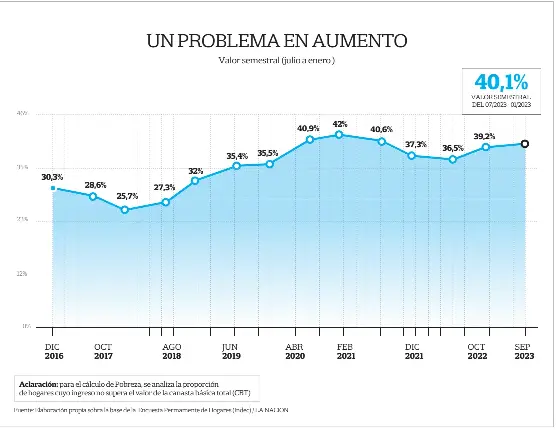 De la mano de la inflación y de la licuación de los ingresos, la pobreza cruzó la barrera del 40% y ya afecta a cerca de 18,5 millones de personas en todo el país. La Encuesta Permanente de Hogares (EPH) del Indec reveló ayer que en el primer semestre del año la pobreza alcanzó el 40,1%, lo que implica un salto de casi un punto frente a la medición de fines de 2022 (39,2%) y de 3,6 puntos en relación con el mismo período del año pasado (36,5%). En tanto, la indigencia –los más pobres entre los pobres– tocó el 9,3%, contra el 8,1% de diciembre del año pasado.
