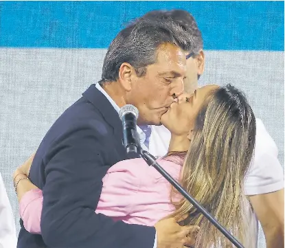 Sergio Massa saluda a su esposa, Malena Galmarini, tras aceptar la derrota