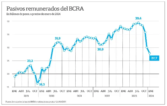 “Siempre planteamos que los pasivos no eran un problema y era algo manejable si reducís el déficit, porque así dejás de emitir y se termina la necesidad de esterilizar pesos. Y eso terminó pasando. No fueron algo explosivo, y si se mira la evolución en diciembre y enero, cayeron fuertemente [en términos reales]”, sintetiza el economista Alejandro Giacoia, de la consultora Econviews.
