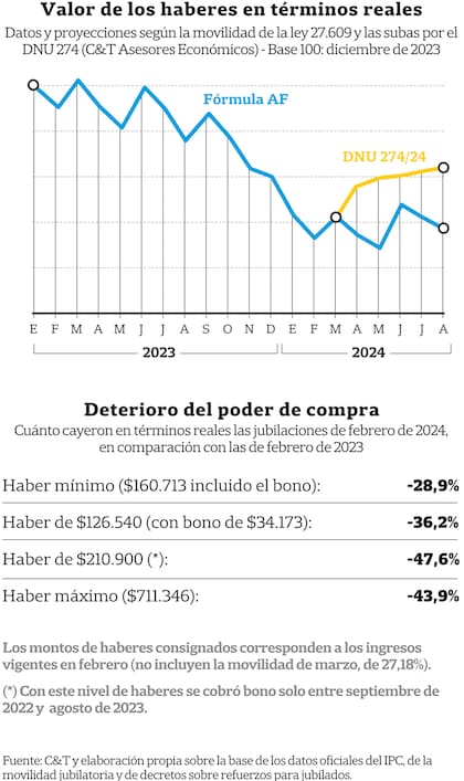 Para agosto, la consultora estima que la jubilación mínima llegaría a $250.625, según afirma la economista María Castiglioni Cotter. Sería así con los reajustes por inflación previstos en el DNU y proyectando una variación del índice de precios al consumidor de 13% para marzo, 10% para abril, 9% para mayo y 8% para junio. Eso llevaría a un aumento acumulado entre noviembre de 2023 y agosto próximo de 186,6%, frente a una inflación estimada de 185,7%. Para ese octavo mes del año, el valor real de las jubilaciones y pensiones –el valor medido según su poder de compra– volvería a ser el mismo que en diciembre de 2023 (ver el gráfico que acompaña esta nota). Es decir, se recuperaría la pérdida que hubo en la primera parte del año.