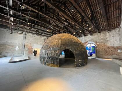 Iglú realizado con bidones de plástico por Romuald Hazoumè en el pabellón de BenínOtra alternativa a la “colgada” tradicional ofrece el sistema expositivo de Lina Bo Bardi, diseñado para el MASP y reproducido en el núcleo histórico de los Arsenales. Los caballetes de vidrio sostenidos por cubos de concreto, creados por la visionaria arquitecta emigrada a Brasil, permiten ver tanto el frente como el reverso de obras de artistas italianos que viajaron y vivieron en otros países. Entre ellos, Elda Cerrato, Juan Del Prete, Clorindo Testa, Lidy Prati y Libero Badíi, emigrados a la Argentina.