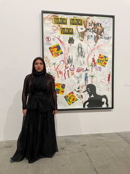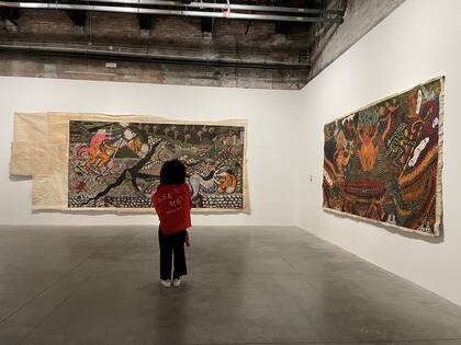 Musa lipídica, de WangShuiUn mensaje y una obra radicalmente distintos a los que se exhiben en la sala contigua, de los peruanos Santiago Yahuarcani y su hijo, Rember, que también participan de la bienal por primera vez. “Desde el 2013 al 2023 –escribe este último en una de sus pinturas de gran formato–, fueron asesinados 32 líderes y lideresas indígenas que defendían sus territorios de invasores, narcotraficantes y mafias de madereros […] La Amazonía es el lugar más peligroso para los ciudadanos indígenas”.