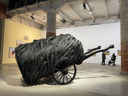 Pinturas del peruano Santiago Yahuarcani exhibidas junto a las de su hijo RemberUn escenario apocalíptico similar evoca Wastelands (2024), instalación del neozelandés Brett Graham, que también debuta en Venecia. Es una carreta cubierta de anguilas, con brazos que parecen pedir ayuda. Hace referencia a los pantanos perdidos por los indígenas maoríes –y a los peces que les servían de alimento– cuando el gobierno los consideró un “desperdicio” y los drenó para reconvertirlos en tierras de cultivo. Resuena así con el tema elegido por Pedrosa para esta edición de la bienal: “Extranjeros en todas partes”.