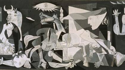 Pablo Picasso (1881-1973)La obra sobre la ciudad arrasada es de grandes dimensiones (351 x 782 cm) y en ese plano, ligado por invisibles líneas que forman triángulos, se representan a tres mujeres expresando su dolor, una con un niño muerto en brazos y otra con un guerrero sin vida. El caballo atravesado por una lanza, una figura central en la obra, es una alegoría a las víctimas inocentes de la contienda, mientras que el toro representa la brutalidad y la oscuridad de la contienda.