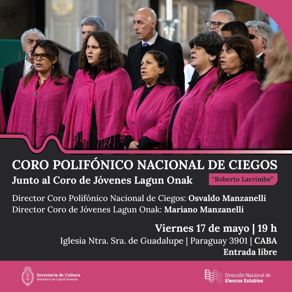 Osvaldo Manzanelli director del elenco nacional Coro Polifónico Nacional de ciegos y Mariano Manzanelli director del coro Lagun Onak, presentarán repertorio académico sacro y popular universal y latinoamericano.