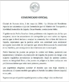 “La Oficina del Presidente repudia las calumnias e injurias formuladas por el Ministro de Transporte y Movilidad Sostenible de España, Óscar Puente, contra Javier Milei”, señaló la cuenta oficial del Gobierno a través de un comunicado.