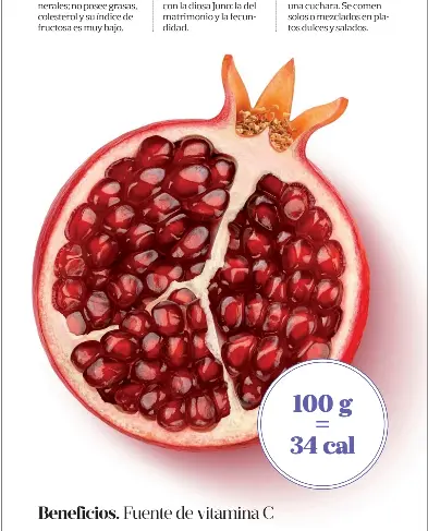 La granada es una baya de gran tamaño cubierta por una piel gruesa y brillante en tonos rojos, amarillos y verdes. “En su interior aloja múltiples granos rellenos de una pulpa colorada y jugosa ideal para sumar a ensaladas y desayunos. Incluso queda muy bien en yogures y preparaciones con queso”, cuenta Andrea Victoria Greco, licenciada en Nutrición. Es rica en vitaminas y minerales; no posee grasas, colesterol y su índice de fructosa es muy bajo.