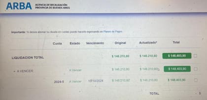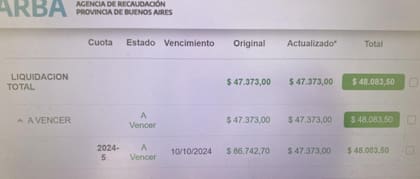 "Entré a la web de ARBA para ver el monto de la última cuota a pagar y figura el próximo pago del 10 de octubre por el doble de lo que pagué en agosto."