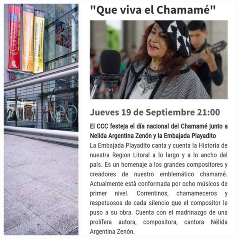 19 de septiembre "Día Nacional del Chamamé" nos encontraremos en el CCC (Centro Cultural de la Cooperación Floreal Gorini) Corrientes 1543, Ciudad de Buenos Aires, para enchamigarnos en un recital lleno de canciones de todos los tiempos.
