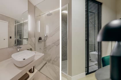 Los paños fijos de vidrio se protegieron con persianas americanas de madera con cinta de gros, lindas de ver dentro de la habitación, que se manejan con domótica.@miserereok“Así como ahora la corriente al reformar es integrar las cocinas (incluso en departamentos clásicos), lo mismo puede suceder con el baño. Es el siguiente paso”, dice la interiorista Sofía Camps.