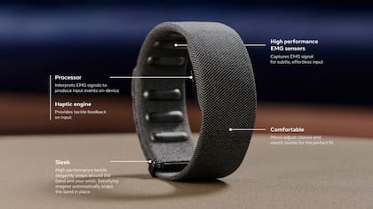 La muñequera es la evolución de la que presentó en 2021, y la clave ahí es la sigla EMG, de electromiografía, que puede detectar los impulsos eléctricos que el cerebro le envía a la mano para mover los dedos, girar la palma, etcétera. Por qué: permite entender esos movimientos con gran precisión, sin obligarnos a tener un control remoto en las manos, o hacer un gesto delante de las cámaras de los anteojos. Los Vision Pro, por ejemplo registran cuando hacemos un gesto de pinzas con el índice y pulgar gracias a una cámara; acá podemos tener la mano en cualquier lugar, y hay más gestos posibles para registrar. Y si lo que la compañía prometía en 2021 es cierto, con esta muñequera podríamos tipear sobre cualquier superficie, el sistema sabrá si rotamos la muñeca o la doblamos, si hacemos un puño, etcétera.