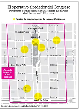 Las fuerzas de seguridad tendrán una dificultad extra: la cantidad y disparidad de puntos de concentración de los sindicatos, organizaciones, movimientos sociales y colectivos que se movilizarán. Los puntos de convocatoria son Rivadavia y Rodríguez Peña; Alsina 1223; Avenida de Mayo y Lima; Callao al 200; Hipólito Yrigoyen y Solís; San Juan y Entre Ríos, y el propio Congreso.