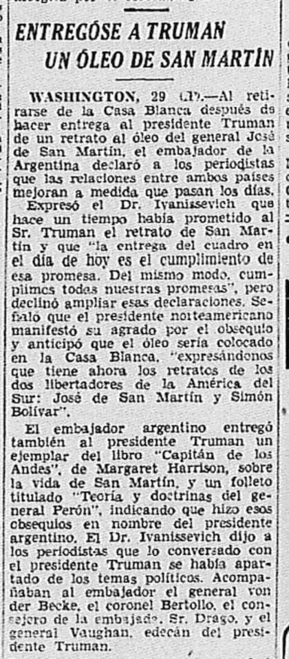 La noticia fue reflejada en la prensa argentinaEntusiasmado por poder completar su colección de ‘los libertadores de la América del Sur’, el gobernante norteamericano no tardó en colgar su copia de La bandera –como se conoce al famoso retrato de San Martín– en la oficina más importante de la Casa Blanca, y tiempo después –en 1948– sumó un nuevo presente: una réplica del Monumento a San Martín, que también se puede apreciar en las imágenes de archivo. Don José ocupó un lugar privilegiado, frente al escritorio del mandatario, a un costado de la chimenea. Su disposición en el salón fue variando con los años y permaneció allí hasta el año 1957, bien entrada la presidencia de Dwight D. Eisenhower, sucesor de Harry Truman.