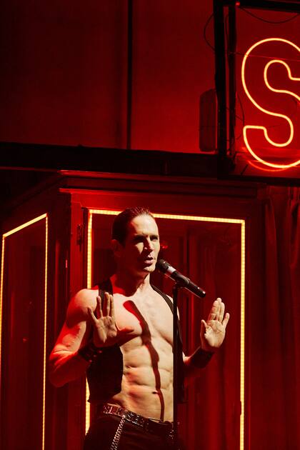 “Al principio me costaba hacer el desnudo completo, pero hoy lo disfruto mucho. Muscari me dijo que me animara, que me iba a gustar, y tenía razón. Es un momento puntual en la ducha, un cuadro con un clima muy especial. Están todos los cuerpos, no hay nada hegemónico, todo se deconstruye. Me interesa el concepto de Sex de aprender y desaprender”, ahonda Martín Salwe, quien participa del cuadro en el que Flor Anca canta “I See Red” junto al elenco masculino como Dios lo trajo al mundo.