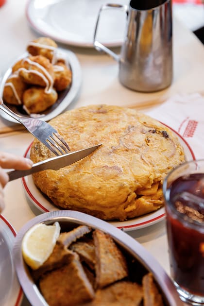 ¿Qué piden todos esos clientes? Clásicos infalibles como las gambas al ajillo, el rabo de toro, los callos a la madrileña o la paella de mariscos, pero muy especialmente la tortilla. “Para lograr una tortilla de primera calidad hay que usar productos de primera calidad. La tortilla pertenece a la llamada ‘cocina de producto’, en donde buena materia prima, utilizada con criterio y respeto, logra excelentes resultados”, apunta Gastón Caretti, director gastronómico del Grupo Sottovoce, a cargo del lugar. En ese sentido, aquí se usan huevos pastoriles orgánicos de gallinas alimentadas a granos, papas de variedades específicas como Frital INTA, INTA Pampeana o Innovator, cebolla española y aceite de oliva.