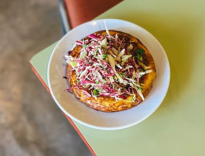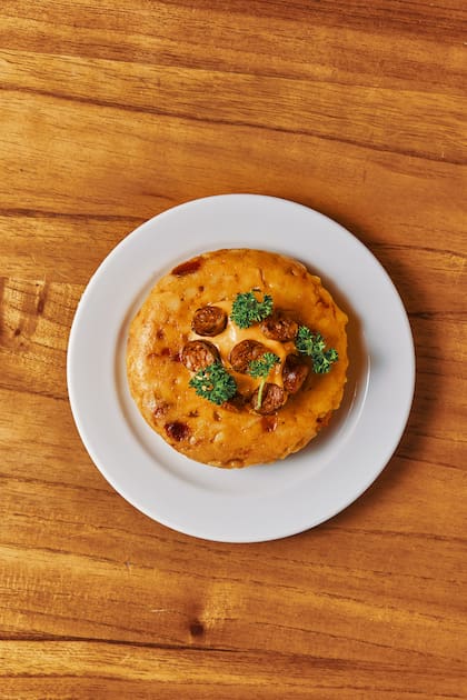 Desde el primer día que este bodegón moderno abrió sus puertas, la tortilla de papas fue parte del menú de Condarco. Aunque la receta fue evolucionando con el correr del tiempo hasta llegar a su versión definitiva, hoy es uno de los platos favoritos de sus comensales habitué. “Se distingue por su corteza fina de color amarillo pálido y su relleno extra cremoso”, detallan. Si bien el punto es babé, la diferencia está en la técnica utilizada para lograr una textura de puré húmedo, con unas papas que se desarman y unos huevos bien untuosos, que no quedan líquidos ni se desparraman por el plato. Se hace con huevos orgánicos y se presenta con lactonesa de ajo, un poco de perejil fresco y unas rodajas de focaccia de la casa.