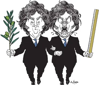 En el fin de semana en el que Milei iba de Macron a Lula, algunos de sus seguidores más fanatizados, liderados por el médico santiagueño Daniel Parisini, más conocido como el Gordo Dan en las redes sociales, lanzaban la corriente Las Fuerzas del Cielo con escenografía similar a la del imperio romano. Esa decoración llevó a la suposición de que detrás del lamentable evento libertario estaba el poderoso asesor presidencial Santiago Caputo, a quien le gusta jugar con los cachivaches de la Roma imperial, aunque algunos deslizaron que fue su hermana, Karina Milei, quien autorizó el acto. Nadie sabe si el Presidente estuvo al tanto de lo que sucedería en el partido bonaerense de San Miguel entre tanto ajetreo internacional, que incluyó una reunión con Trump en la residencia de Mar-a-Lago, en Florida a mediados de la semana anterior.